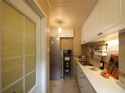 開放式的廚房,空間雖小,卻樣樣齊全,色調(diào)與客廳是一致的。