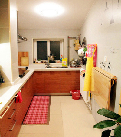 開放式的廚房能節(jié)省不少空間,蘋果綠色很漂亮,桌靠墻擺放 留出的過道恰恰好。