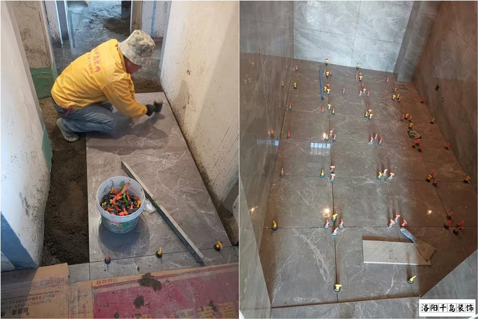 第七步、廚衛(wèi)瓷磚完成之后,鋪貼大地磚,大地磚鋪貼也有兩種工藝。一種是水泥澆漿法,一種是背涂灰。