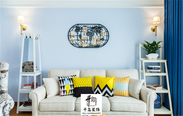 簡單的黃色能在淺色系的裝修中起到很好的點綴效果。淡藍色的有色乳膠漆作為背景墻,搭配素色的布藝沙發(fā),黃色的沙發(fā)靠枕,一下子給簡單素雅的客廳帶來了一絲活力,給人悠閑恬靜的感覺。