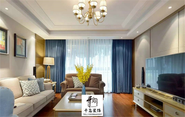 客廳中,簡單白色的石膏板,布藝沙發(fā)搭配淡藍色的抱枕,深藍色的遮光窗簾加上一層紗窗有,銀黃色木質(zhì)茶幾和電視柜,搭配藍色瓶底和黃色仿真花,色系上銜接的恰到好處。