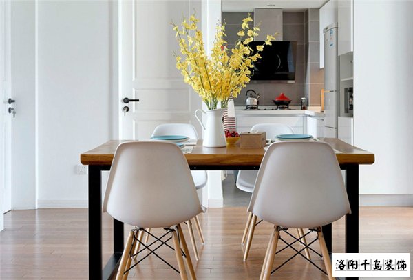 餐廳的空間不大,在廚房與客廳的過渡區(qū),硬裝為白色的墻面,原木色的地板,與整體風格契合,既樸實又簡潔。餐桌選用非常經(jīng)典的北歐風格,不刻意修飾的桌面板材,配上粗壯的鐵藝腿部支撐,兼具了時尚和工業(yè)風的格調(diào),再配上造型前衛(wèi)的休閑椅,令這個空間雖然簡單卻不孤單。桌面用陶瓷花瓶,配上鮮艷的仿真絹花裝點,給這塊空間帶來明媚的色彩。