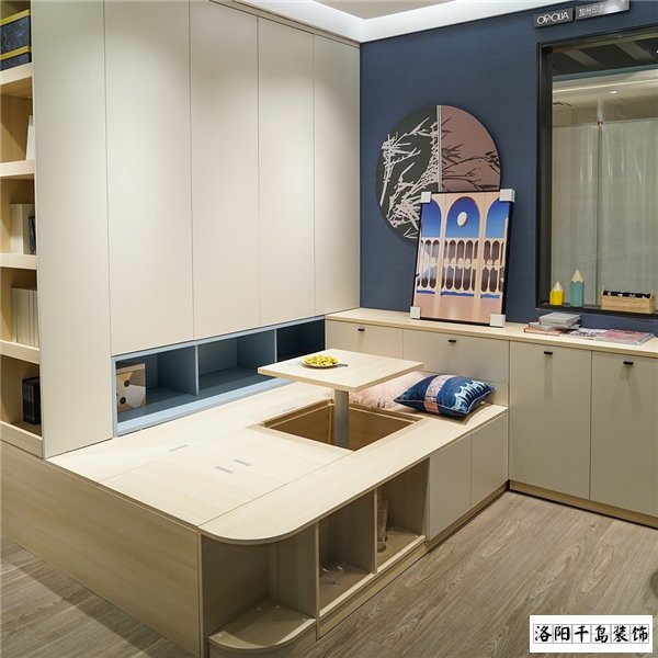 我選的是這款定制榻榻米,清爽的色調(diào),看著就讓人覺得舒服。環(huán)繞式的一體設(shè)計,配備的還挺齊全,有衣柜、床、書桌等。