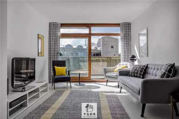 客廳的家具、布藝材質都是灰白系的淡雅色調,布藝上的格子印花增添紋理感,點綴色彩的巧妙做法是靛藍色與淺灰色單人沙發(fā)上,各放了一個檸檬黃的枕頭,使這片淺色調區(qū)域有了視覺焦點。