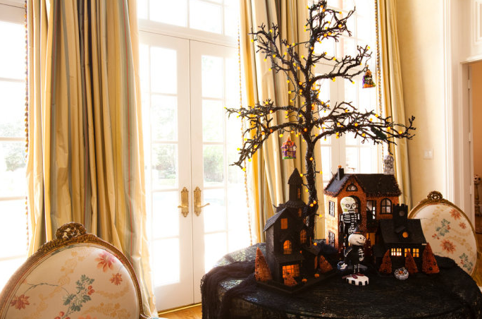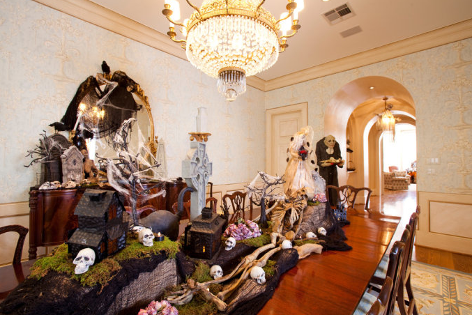 萬圣節(jié)當(dāng)天,餐桌是必須要布置的,畢竟我們是要吃飯的。圖中餐桌上的黑南瓜及食物,黑白配的燭臺(tái),再加上骷髏頭,好像在以食物祭拜祖靈及善靈以祈平安渡過嚴(yán)冬一樣,還是一款不錯(cuò)的家具布置吧!